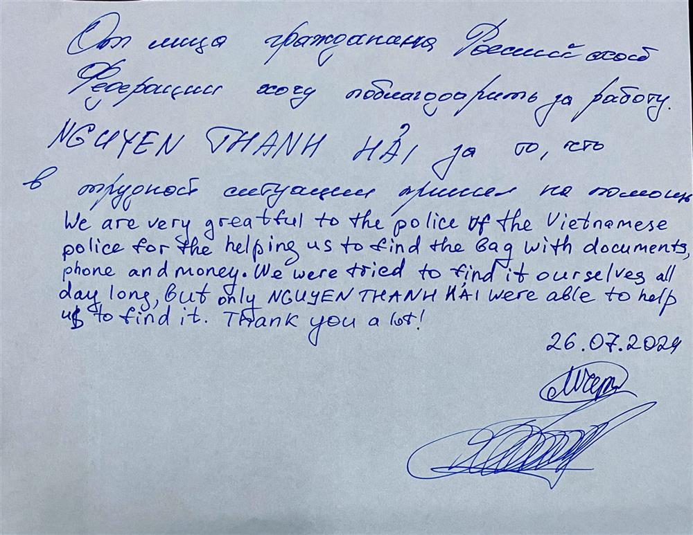 | Dòng thư tay cảm ơn từ 2 du khách người Nga gửi đến lực lượng Công an. |