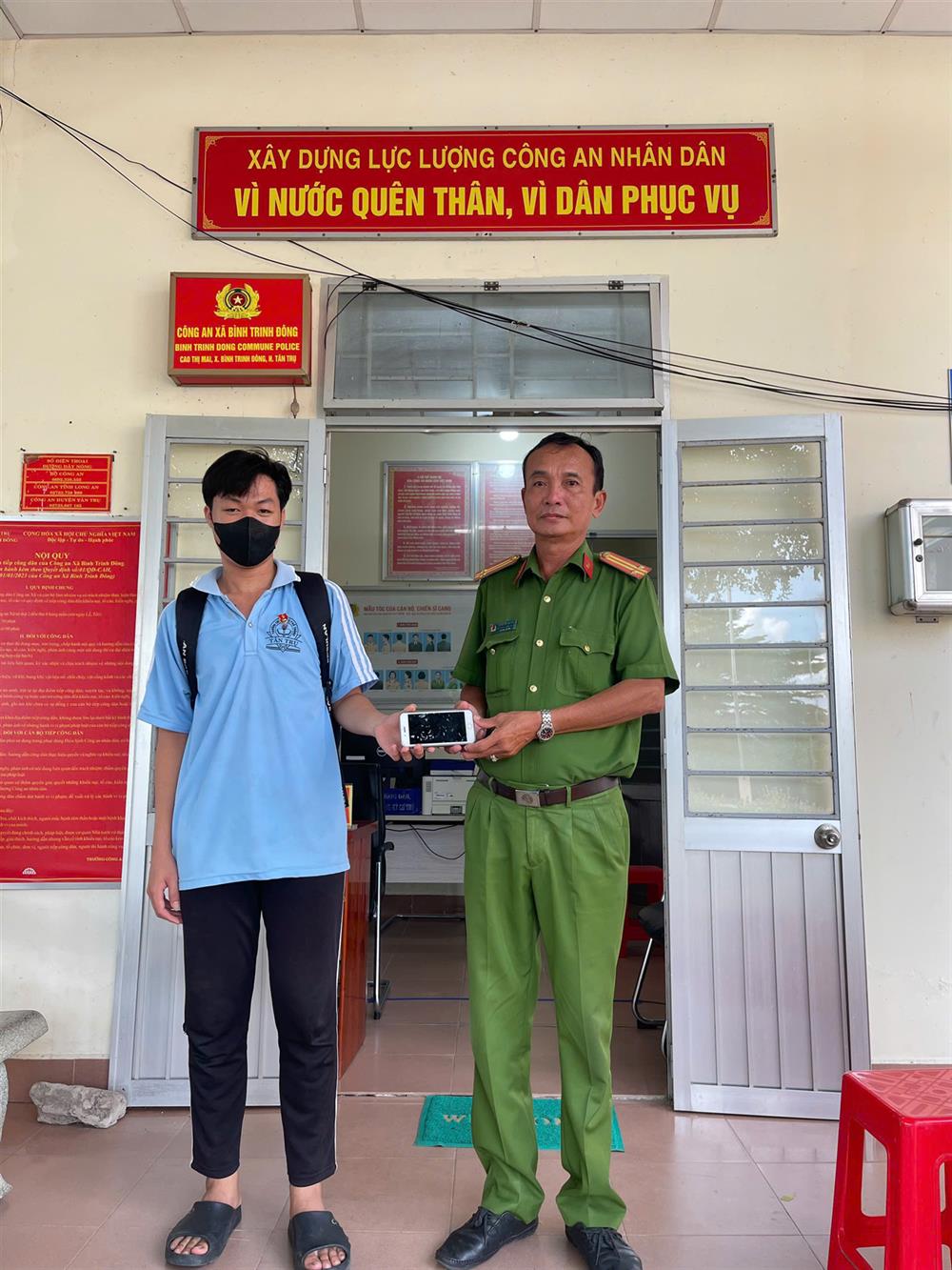 | Em Nguyễn Cao Minh trao điện thoại nhặt được cho Công an xã Bình Trinh Đông để tìm, trả lại cho người đánh rơi |