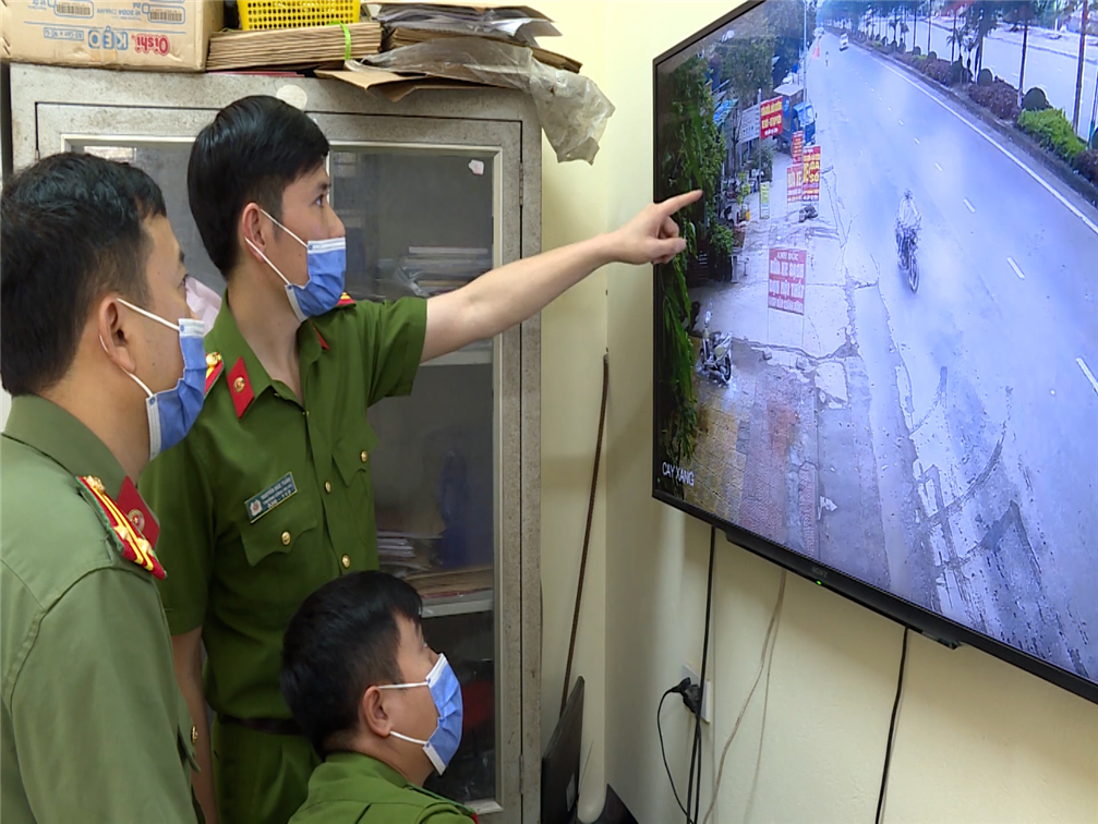 | Thiếu tá Nguyễn Đức Tuấn cùng đồng đội nắm tình hình ANTT qua hệ thống camera an ninh. |