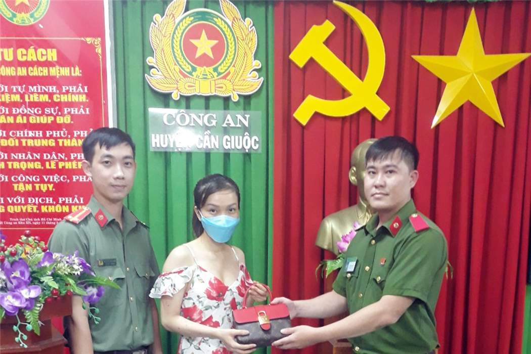 Ngay lập tức, đồng chí Giàu và Hà đã báo cáo Ban chỉ huy Công an huyện Cần Giuộc để tiến hành xác minh, trao trả tài sản cho người đánh rơi. Cùng ngày, sau khi nhận được thông tin của Công an huyện, chị Thơ đã đến Công an huyện Cần Giuộc để nhận lại tài sản.