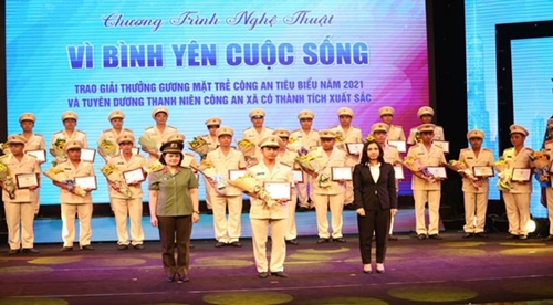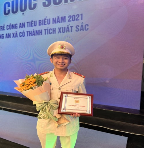 | Trung úy Trịnh Hữu Đệ nhận biểu trưng và hoa tại Lễ tuyên dương thanh niên Công an xã có thành tích xuất sắc năm 2021. |