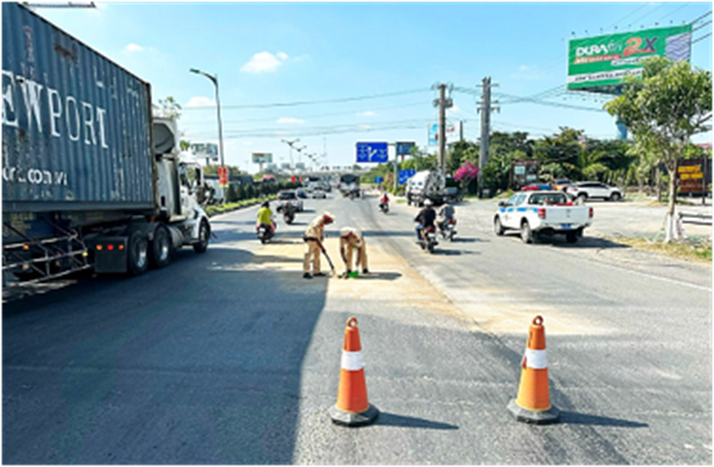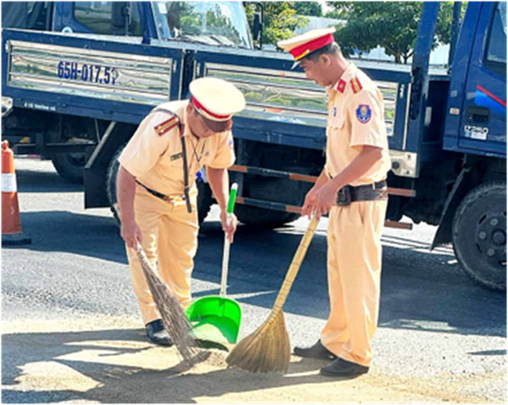 Cảnh sát giao thông Cần Thơ dọn dẹp cát rơi trên đường để đảm bảo an toàn giao thông