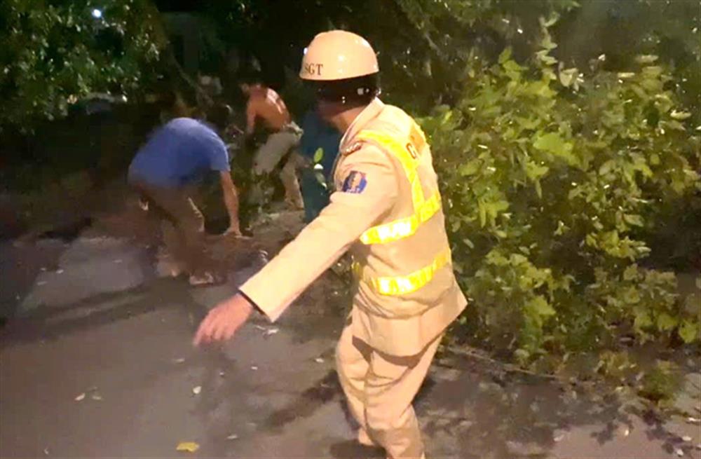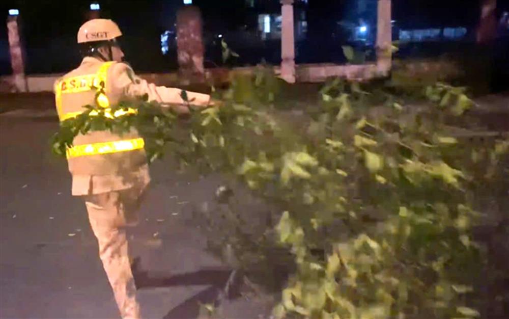 Cảnh sát giao thông Hòa Bình dọn dẹp cây cổ thụ gãy đổ chắn ngang lòng đường, đảm bảo an toàn giao thông