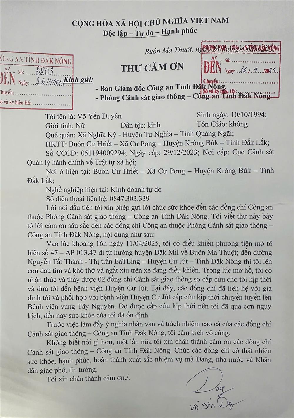 Sau khi sức khỏe ổn định, ngày 29/4/2025, chị Võ Yến Duyên đã gửi thư đến Công an tỉnh Đắk Nông bày tỏ lòng cảm phục trước tinh thần vì Nhân dân phục vụ của cán bộ, chiến sĩ Đội Cảnh sát giao thông đường bộ số 1, Phòng CSGT, Công an tỉnh trong việc nhanh chóng hỗ trợ đưa chị đến bệnh viện cấp cứu kịp thời.