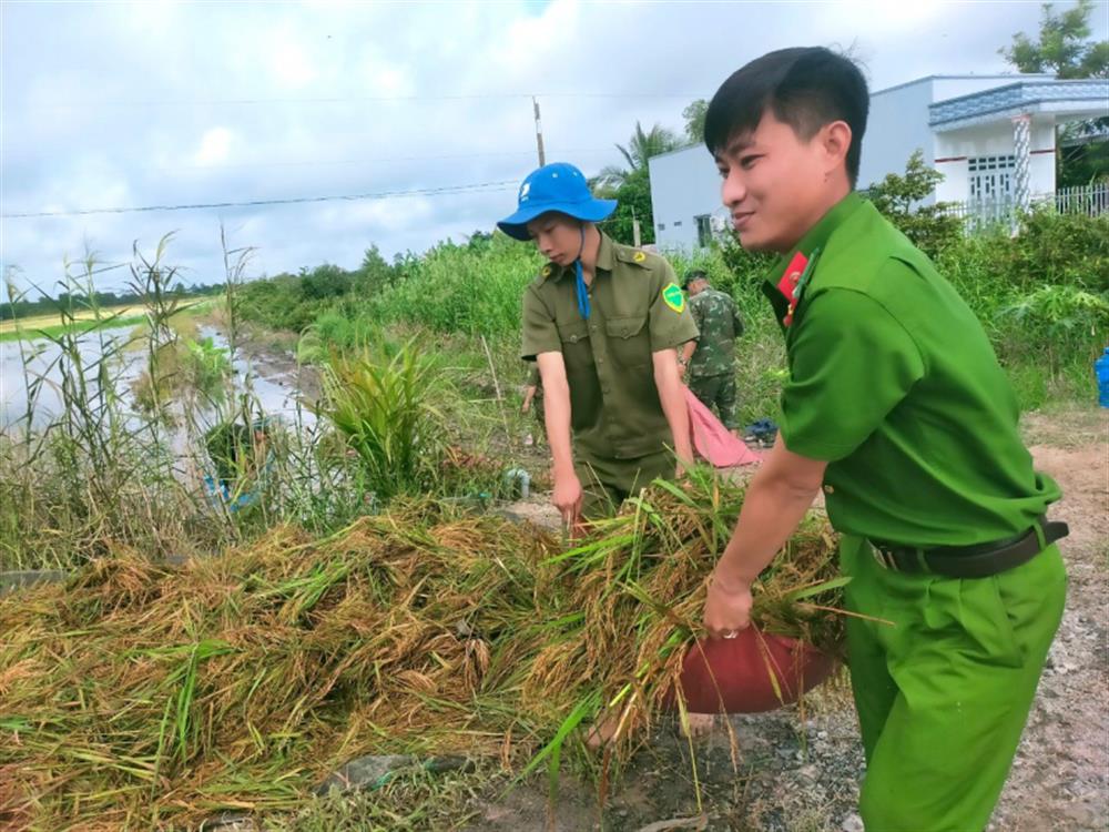 Trước tình hình trên, đoàn viên thuộc Chi đoàn Công an huyện Thạnh Hóa phối hợp với lực lượng Quân đội đến hỗ trợ, giúp dân thu hoạch lúa. Dưới ruộng nước ngập sâu ngang thắt lưng, trên đầu trời nắng gắt nhưng các cán bộ, chiến sĩ Công an và Quân đội vẫn dầm mình, hăng hái gặt lúa, không để lúa bị hư hỏng khiến người dân cảm kích. Nhiều bà con nông dân chia sẻ, nếu các chiến sĩ Công an và Quân đội không hỗ trợ, giúp gặt lúa kịp thời thì vụ mùa lần này người nông dân Thạnh Hóa coi như mất trắng.