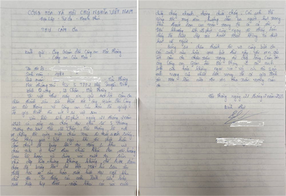 Hành động khẩn trương chữa cháy và cứu nạn, cứu hộ của cán bộ, chiến sĩ Cảnh sát PCCC&CNCH Công an thành phố Hải Phòng được người dân ngợi khen. Ngay trong ngày, gia đình ông L, chủ nhân ngôi nhà trên đã gửi Thư cảm ơn tới Giám đốc Công an thành phố, Phòng Cảnh sát PCCC&CNCH đã không ngại vất vả cứu tài sản và tính mạng người dân.