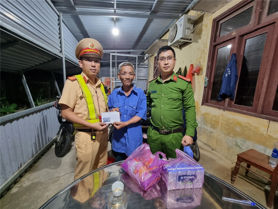 | Cảnh sát giao thông và Công an xã Nghĩa Điền hỗ trợ ông Phạm Hữu Bình về quê. |