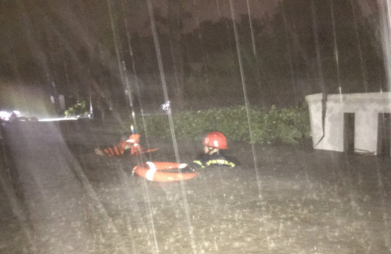 | Lực lượng cứu nạn, cứu hộ Công an thành phố Uông Bí xuyên đêm trong mưa bão làm nhiệm vụ cứu nạn, cứu hộ và giúp dân di dời trong bão số 3. |