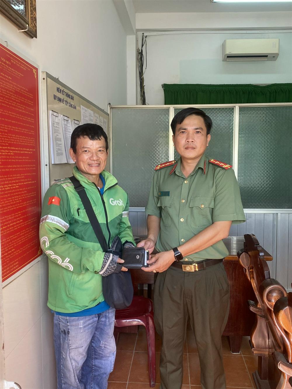 | Đại úy Nguyễn Lê Thi - Cán bộ Đội An ninh Công an huyện Cần Giuộc trao trả tài sản cho người bị mất. |