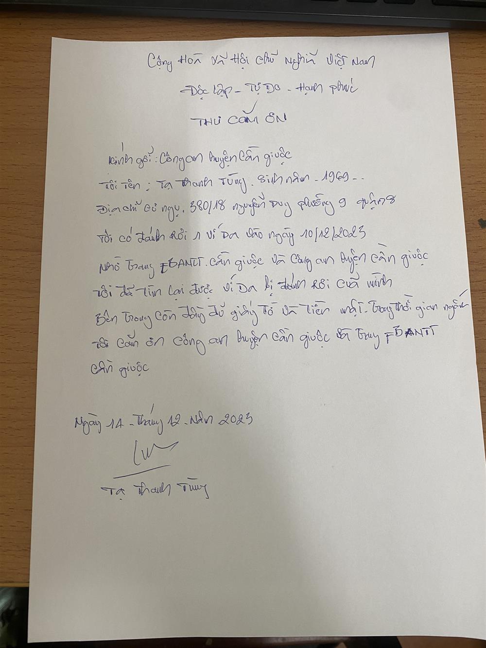 | Thư cám ơn nhận lại tài sản của anh Tạ Thanh Tùng. |