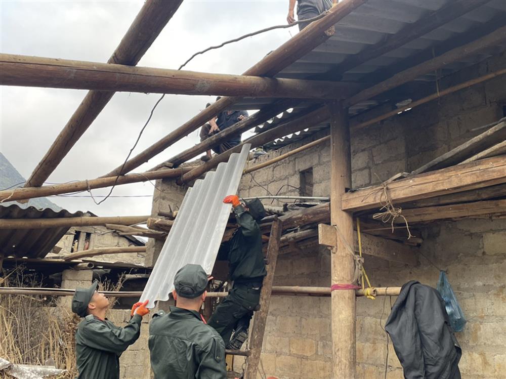 | Cán bộ, chiến sỹ giúp hộ dân Sình Mí Lềnh (thôn Há Lìa, xã Sủng Thài) sửa chữa lại căn nhà bị hư hỏng hoàn toàn. |