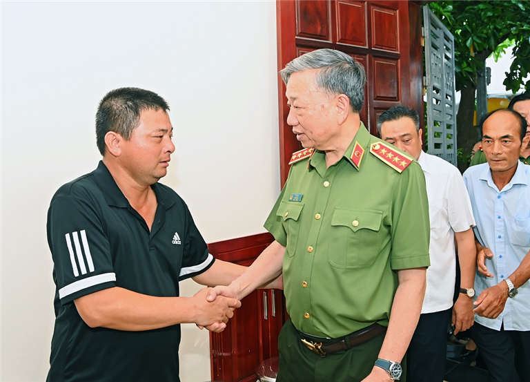 | Bộ trưởng Tô Lâm cùng Đoàn công tác đến thăm hỏi, động viên và chia sẻ với gia đình Hạ sỹ Nguyễn Đình Phúc. |