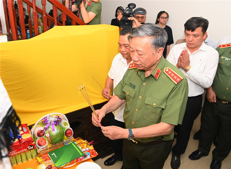 | Bộ trưởng Tô Lâm cùng Đoàn công tác đến thăm hỏi, động viên và chia sẻ với gia đình Thượng tá Đặng Anh Quân. |