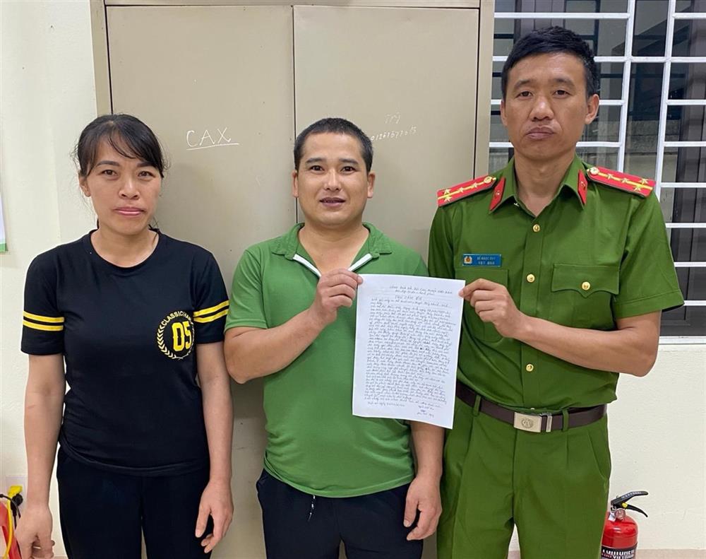 | Vợ chồng anh Đàm Văn Ngụy trao thư cảm ơn Công an xã Xuân Nội. |
