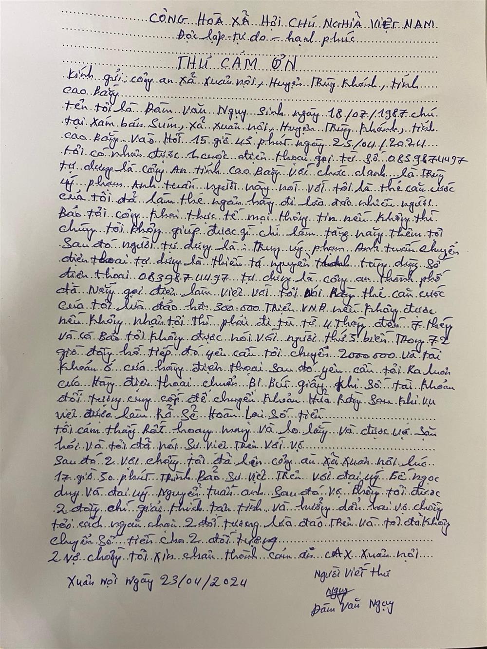 Ngay sau đó, hai vợ chồng anh đến Công an xã Xuân Nội báo cáo vụ việc trên và đã được lực lượng Công an giải thích, động viên, hướng dẫn ngăn chặn kịp thời việc chuyển tiền cho 02 đối tượng lừa đảo trên. Cảm kích trước hành động của lực lượng chức năng, anh Nguỵ đã viết bức thư cảm ơn Công an xã Xuân Nội.