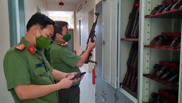 | CBCS lực lượng Hậu cần Công an tỉnh Bạc Liêu kiểm tra vũ khí, công cụ hỗ trợ. |