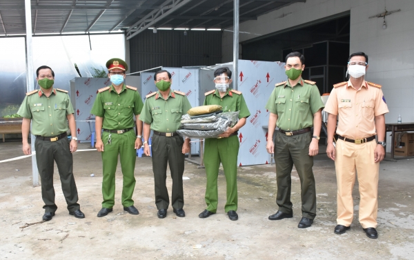 | Đại tá Trần Phong, Phó Giám đốc Công an tỉnh Bạc Liêu trao vật tư tặng các chốt phòng, chống dịch Covid-19. |