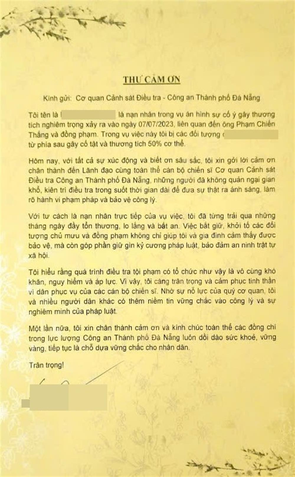Với sự nỗ lực trong điều tra, làm rõ đối tượng chủ mưu, cầm đầu và đồng phạm liên quan đến vụ cố ý gây thương tích xảy ra vào ngày 7/7/2023 tại đường Phan Đăng Lưu, phường Hòa Cường Bắc, quận Hải Châu, thành phố Đà Nẵng, mới đây, Cơ quan Cảnh sát điều tra Công an thành phố Đà Nẵng đã nhận được “Thư cảm ơn” của nạn nhân.