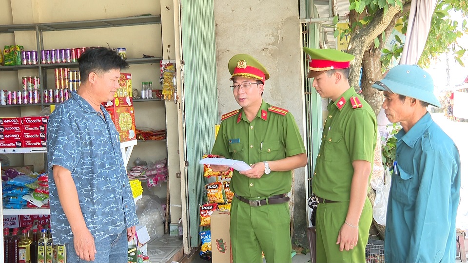 | Thiếu tá Trịnh Văn Dư cùng đồng chí, đồng đội tuyên truyền vận động nhân dân chấp hành nghiêm quy định của pháp luật. |