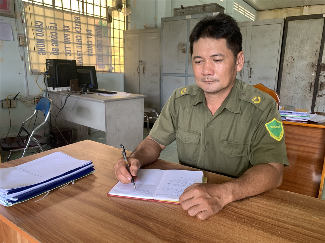 | Anh Ngô Đình Thành Châu làm việc tại trụ sở Công an xã. |
