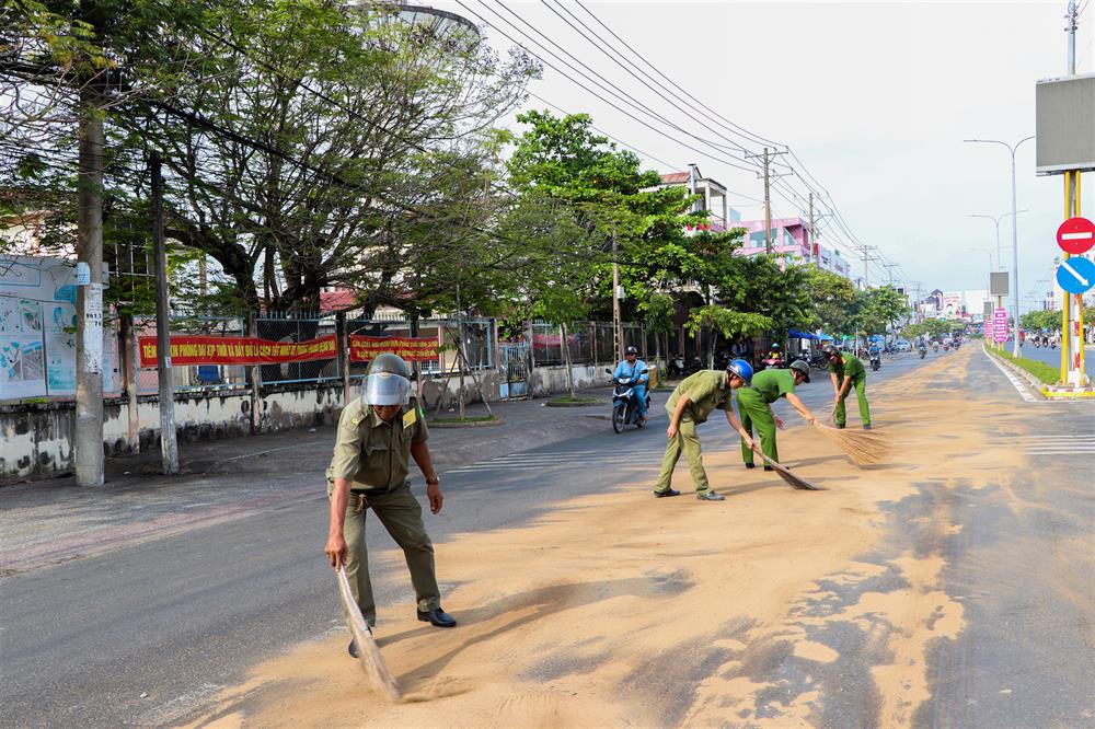 Ngay khi phát hiện vụ việc, lực lượng Công an thành phố Vĩnh Long đã nhanh chóng xuống hiện trường, dùng cát để xử lý vết dầu đổ loang trên đường nhằm chống trơn trợt cho người và phương tiện tham gia giao thông khi di chuyển qua đoạn đường này.