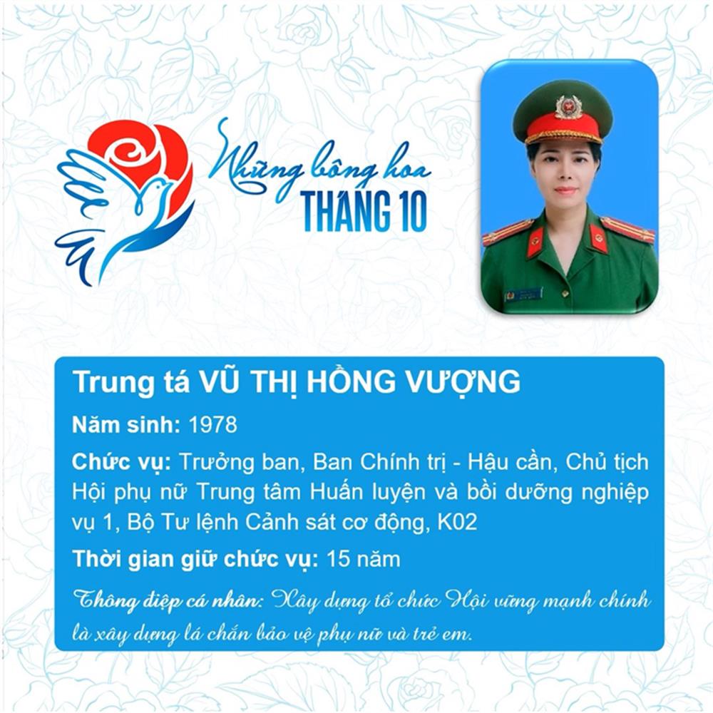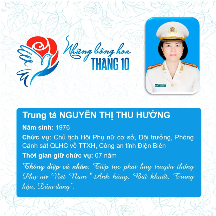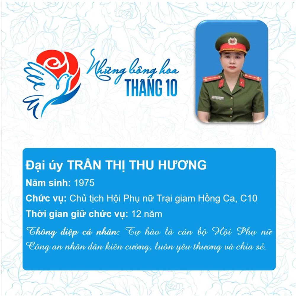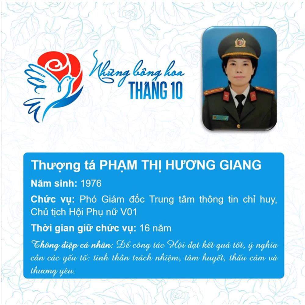 Tham dự Chương trình biểu dương Chủ tịch Hội Phụ nữ cơ sở giỏi toàn quốc năm 2023 do Trung ương Hội Liên hiệp Phụ nữ Việt Nam phối hợp với Bộ Công an tổ chức, trong số 293 Chủ tịch Hội cơ sở giỏi, Bộ Công an vinh dự có 11 đại biểu là Chủ tịch Hội Phụ nữ cơ sở giỏi được vinh danh, gồm: