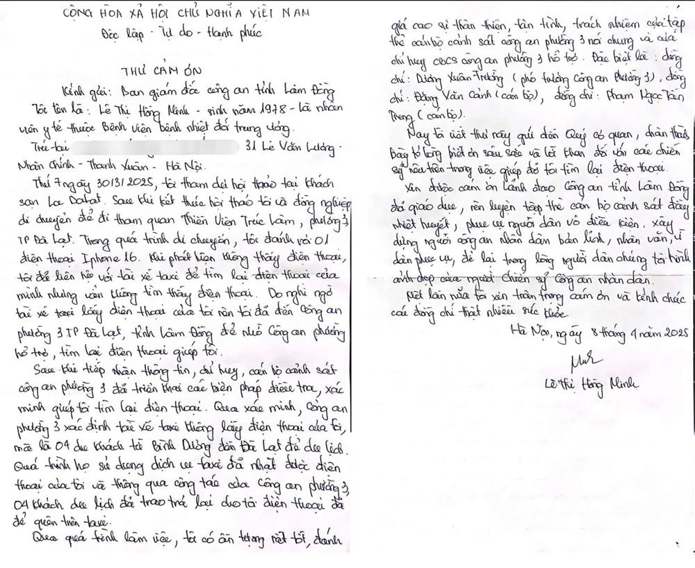 Mới đây, Ban Giám đốc Công an tỉnh Lâm Đồng đã nhận được thư cảm ơn đầy xúc động của chị Lê Thị Hồng Minh (47 tuổi, trú tại quận Thanh Xuân, Hà Nội). Chị Minh chia sẻ trong thư rằng, cuối tháng 3/2025, chị có dịp tham dự hội thảo tại thành phố Đà Lạt. Sau khi kết thúc hội thảo, chị đã đến tham quan Thiền Viện Trúc Lâm, phường 3. Trong quá trình di chuyển bằng taxi, chị không may để quên chiếc điện thoại Iphone 16 trên xe, 4 du khách đến từ Bình Dương cũng sử dụng chiếc taxi này và đã nhặt được điện thoại của chị. Nhờ sự vào cuộc tích cực và hiệu quả của các cán bộ chiến sĩ Công an phường 3, thành phố Đà Lạt, thông qua các biện pháp điều tra, xác minh, chiếc điện thoại đã được tìm thấy và trao trả tận tay cho chị Minh.