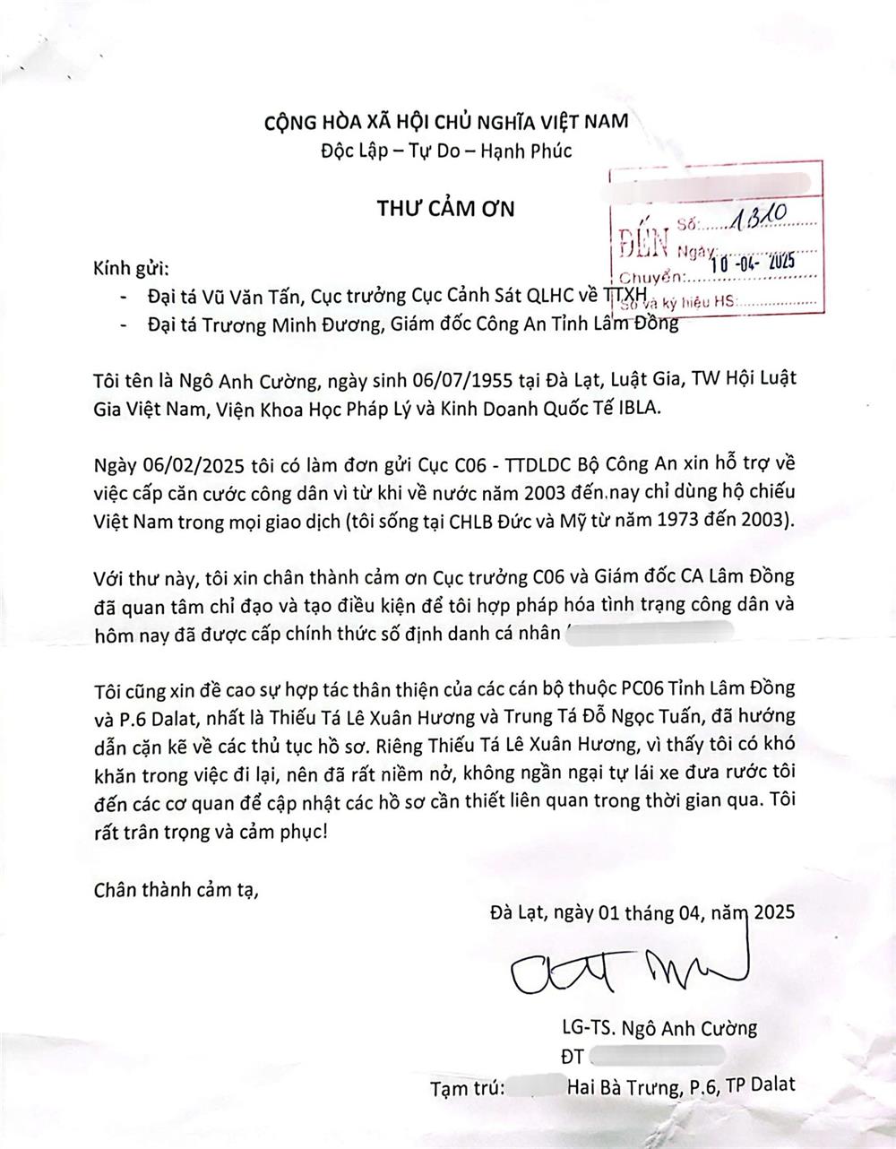 Cùng chung niềm vui và sự cảm kích, ông Ngô Anh Cường (70 tuổi, trú tại phường 6, thành phố Đà Lạt) vừa gửi thư cảm ơn đến đồng chí Giám đốc Công an tỉnh Lâm Đồng. Trong thư, ông Cường chia sẻ về việc đã có nhiều năm sinh sống tại Đức và Mỹ trước khi trở về Việt Nam. Quá trình sinh sống tại phường 6, ông chỉ sử dụng hộ chiếu Việt Nam trong mọi giao dịch mà chưa làm thủ tục cấp căn cước. Nhờ sự hướng dẫn tận tình, chu đáo của cán bộ, chiến sĩ Công an phường 6 và Phòng Cảnh sát QLHC về TTXH, Công an tỉnh Lâm Đồng, ông Cường đã hoàn tất các thủ tục và có được chiếc căn cước của mình.