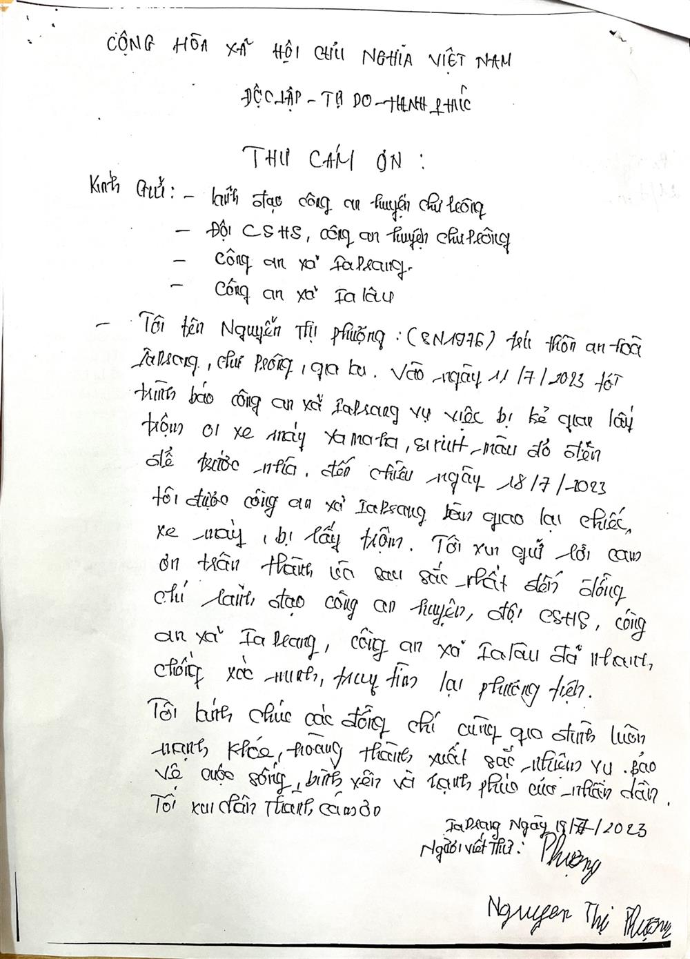 Ngày 18/7/2023, Công an huyện Chư Prông nhận được thư cảm ơn của bà Nguyễn Thị Phượng (trú tại thôn An Hòa, xã Ia Drang, Chư Prông) - nạn nhân của một vụ trộm cắp. Trong thư có đoạn viết: Ngày 11/7/2023, tôi để chiếc mô tô nhãn hiệu Sirius trước cửa nhà thì bị kẻ gian lấy mất. Chỉ trong vòng 24 giờ khẩn trương truy xét, điều tra, Công an huyện đã bắt giữ đối tượng, thu hồi chiếc xe trả lại cho gia đình tôi.