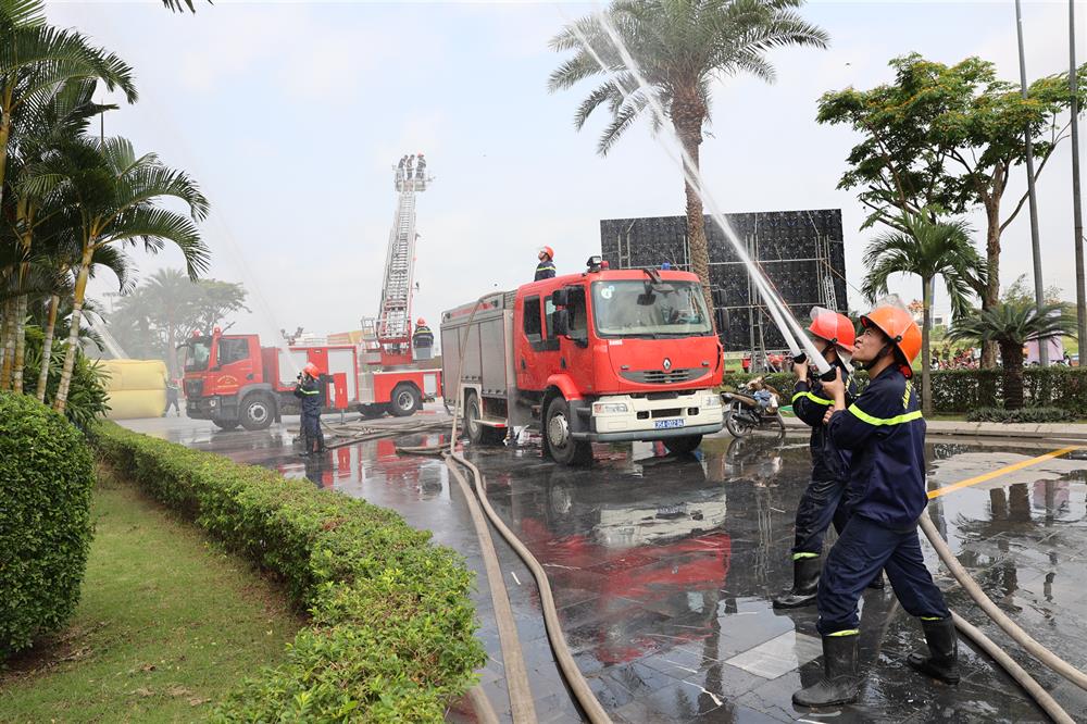 Ngay sau Lễ khai mạc, các lực lượng tham gia diễn tập đã tiến hành diễn tập phương án chữa cháy và CNCH gồm 5 giai đoạn với tình huống giả định: Vào hồi 9 giờ 30 phút, ngày 07/5/2025 xảy ra cháy tại hội trường tầng 2 Khu nhà hàng của Khách sạn The Reed Ninh Bình. Nguyên nhân do trong quá trình tổ chức sự kiện của một công ty tại khu vực nhà hàng của khách sạn, tất cả các thiết bị điện được đẩy lên công suất tối đa, có sử dụng thêm nhiều thiết bị từ bên ngoài như các loa công suất lớn, hệ thống đèn chiếu sáng... làm cho hệ thống đường dây điện tại khu vực nhà hàng bị quá tải dẫn đến chập đường dây, gây cháy. Hệ thống báo cháy, chữa cháy tự động đang trong quá trình bảo dưỡng đã tạm dừng hoạt động nên không đảm bảo hiệu quả chữa cháy ban đầu. Khi xảy ra cháy, chất cháy chủ yếu là lớp vỏ PVC của dây dẫn điện, phông rèm trang trí. Do đây đều là các chất dễ cháy, nên đám cháy phát triển nhanh và có nguy có cháy lan sang các khu vực khác.