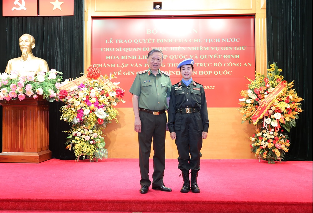 | Bộ trưởng Tô Lâm chụp ảnh cùng Trung tá Lương Thị Trà Vinh tại Lễ trao Quyết định của Chủ tịch nước cho sĩ quan đi thực hiện nhiệm vụ GGHB Liên hợp quốc. |