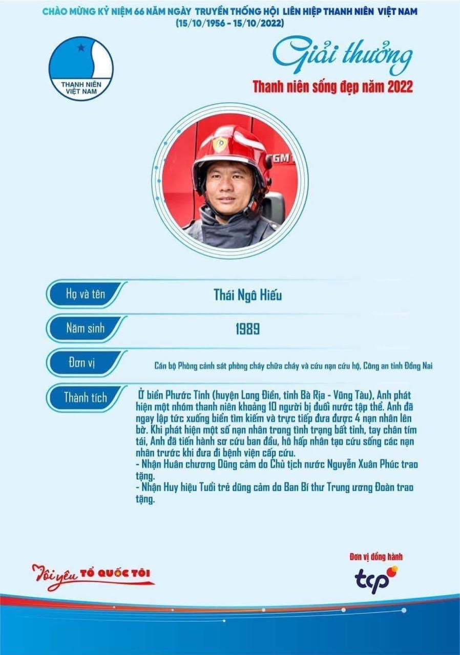Sáng 16/10, sau khi vinh dự nhận Giải thưởng “Thanh niên sống đẹp” năm 2022 do Trung ương Hội Liên hiệp thanh niên Việt Nam trao tặng, Đại úy Thái Ngô Hiếu cho biết, anh sẽ dùng toàn bộ tiền thưởng để hỗ trợ, chăm sóc cho trẻ có hoàn cảnh đặc biệt khó khăn do tác động của dịch bệnh COVID-19 theo Chương trình “Mẹ đỡ đầu” của Hội Phụ nữ cơ sở Phòng Cảnh sát Phòng cháy, chữa cháy và cứu nạn cứu hộ Công an tỉnh Đồng Nai.