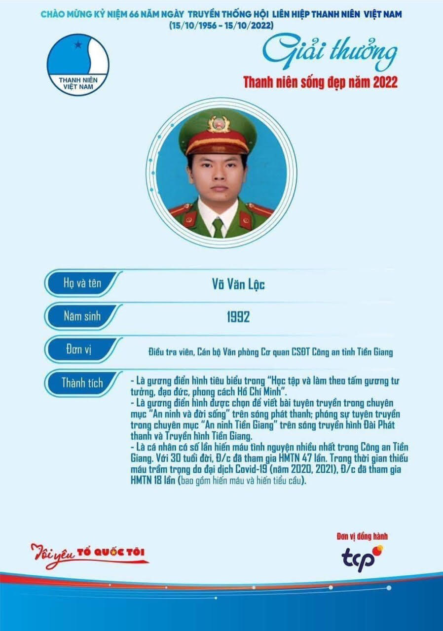 Với thành tích xuất sắc trong công tác chuyên môn cũng như trong hoạt động đoàn, Thượng úy Võ Văn Lộc được tặng nhiều Bằng khen, Giấy khen của Bộ Công an, Ủy ban nhân dân tỉnh, Giám đốc Công an tỉnh, các ban ngành, đoàn thể. Năm 2021 nhận giải thưởng “Thanh niên Công an Tiền Giang tiêu biểu”; 2 năm liền (2020 - 2021) đạt danh hiệu “Chiến sĩ thi đua cơ sở”, được Bộ Công an tặng Bằng khen trong phong trào thi đua “Vì ANTQ” giai đoạn năm 2020 – 2021. Tối 14/10 vừa qua, Thượng úy Võ Văn Lộc vinh dự là một trong 20 gương mặt thanh niên tiêu biểu nhận Giải thưởng “Thanh niên sống đẹp” năm 2022 do Trung ương Hội Liên hiệp thanh niên Việt Nam trao tặng.