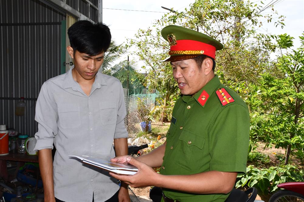 | Đại úy Võ Hoàng Chơn dành nhiều thời gian để tuyên truyền, vận động người dân cảnh giác với các loại tội phạm. |
