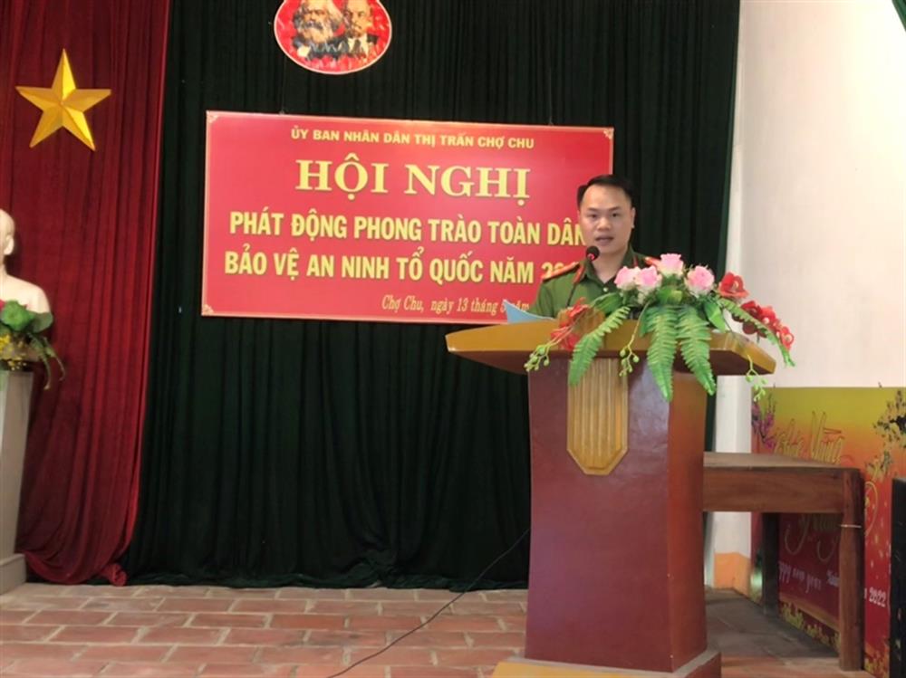 | Đại úy Nguyễn Thiện Thuật tại Hội nghị Phong trào toàn dân Bảo vệ an ninh Tổ quốc năm 2022 của UBND Thị trấn Chợ Chu. |