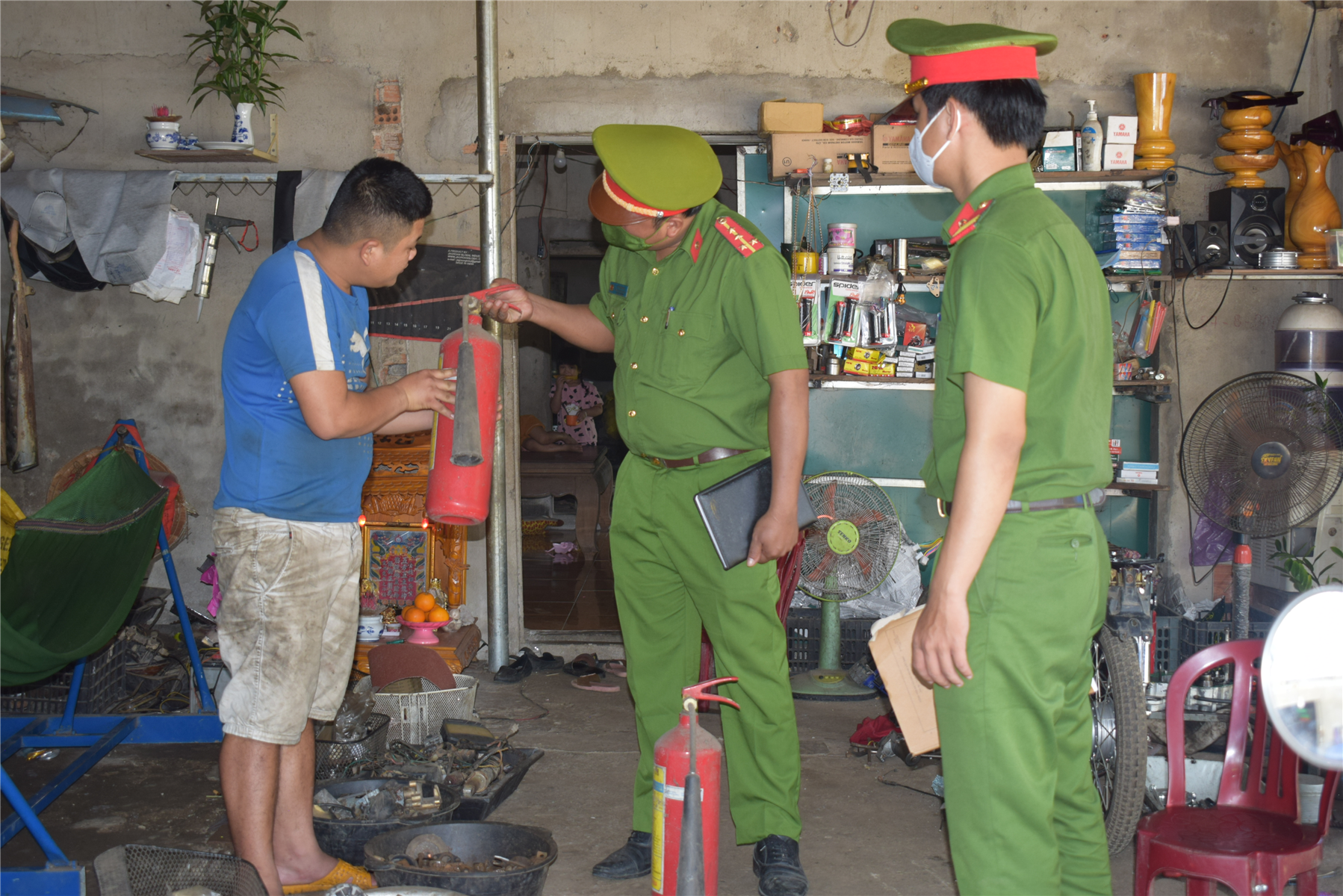 | Đại úy Hồ Văn Định trực tiếp hướng dẫn công tác phòng cháy, chữa cháy đối với các hộ nhà ở kết hợp sản xuất, kinh doanh trên địa bàn. |