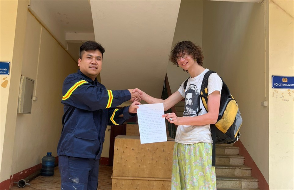 | Du khách người Anh trao bức thư cảm ơn đến Công an tỉnh Lai Châu. |